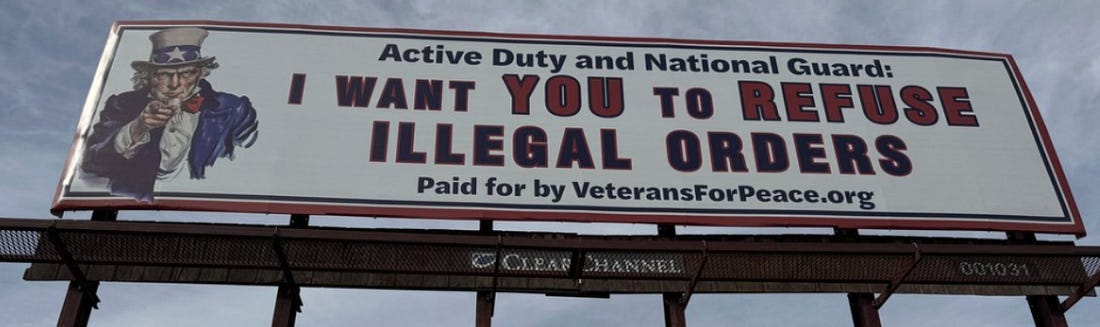 Veterans For Peace put up a billboard in Tucson, Arizona, to amplify a message from Sen. Mark Kelly and other Vets in Congress who released a video urging troops not to follow illegal orders.