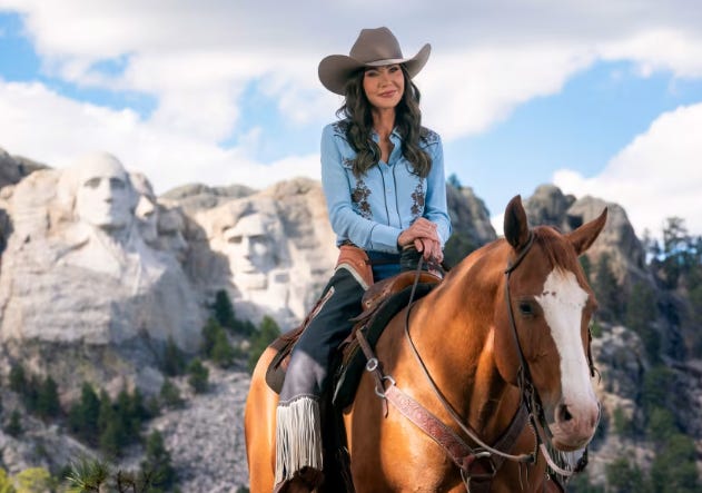 While we’re at it, let the photos distract from the reality of ICE agents performing their duties with the nuance of a Nazi. This is when Noem decided to run an anti-immigration television ad featuring herself. Resplendent in cowboy hat and on a horse, this ad blitz set taxpayers back $220 million.